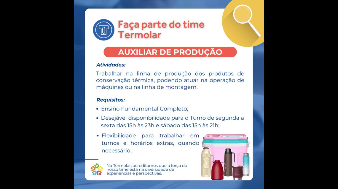 TERMOLAR oferece uma oportunidade de carreira na área industrial para pessoa Auxiliar de Produção. Nós estamos procurando alguém que seja responsável, comprometido(a) e pontual, com uma forte ética de trabalho e disponibilidade de horário.