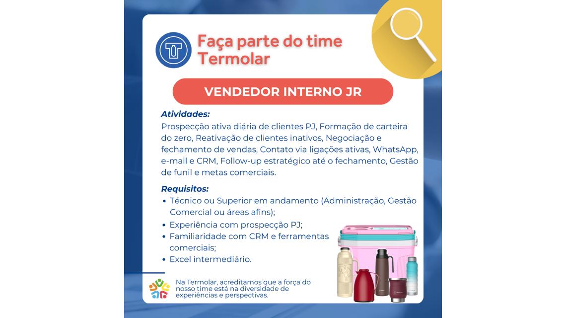 A TERMOLAR está com oportunidade para Vendedor(a) Interno(a) Jr na área industrial, se você tem perfil comercial, gosta de prospecção ativa e quer desenvolver novos negócios no segmento B2B, essa pode ser a oportunidade ideal para impulsionar sua carreira.