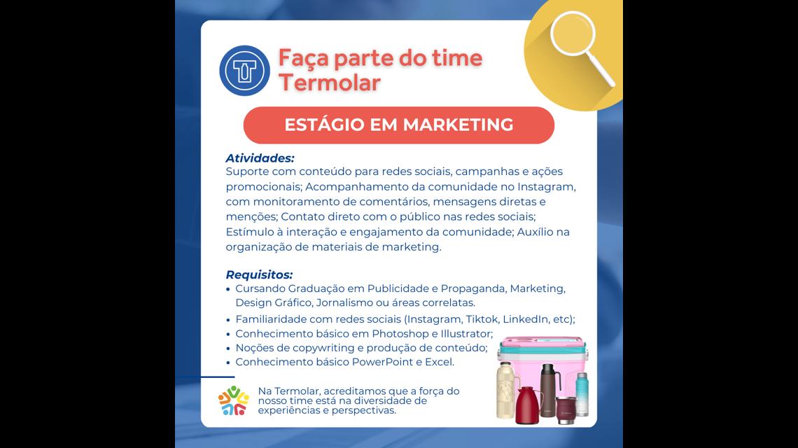 TERMOLAR oferece uma oportunidade de carreira na área industrial para pessoa Estagiária na área de Marketing. Nós estamos procurando alguém que seja responsável, comprometido(a) e pontual, com uma forte ética de trabalho e disponibilidade de horário.