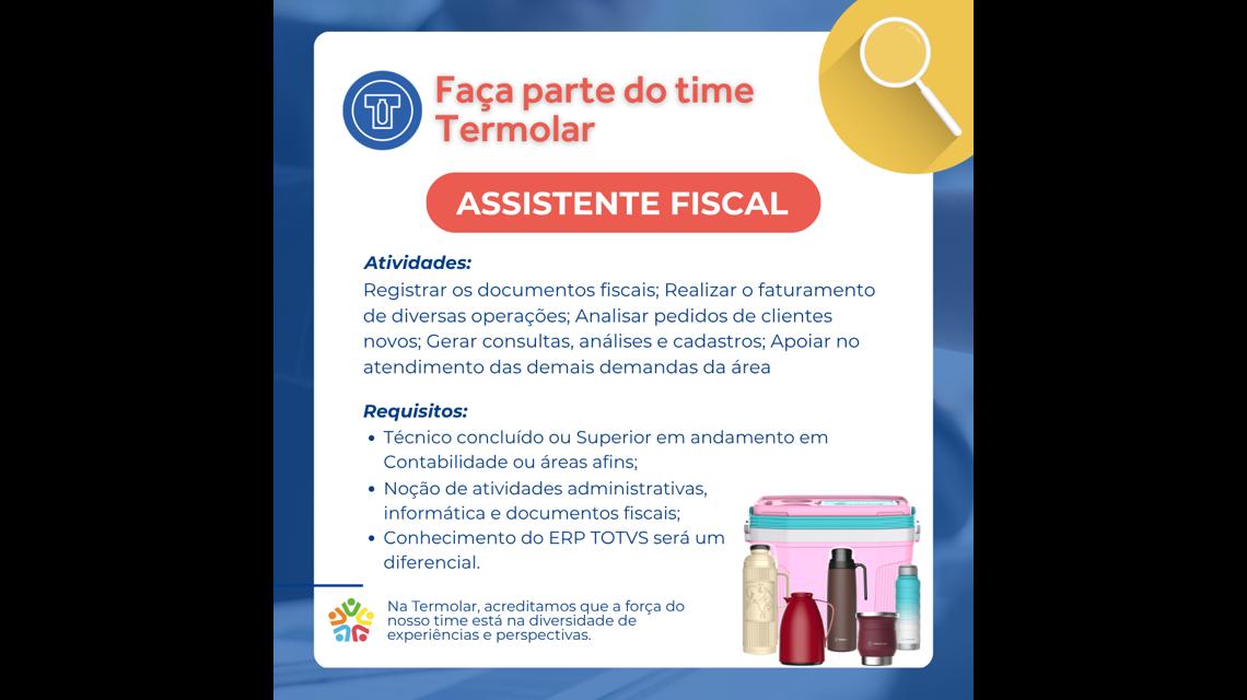 TERMOLAR oferece uma oportunidade de carreira na área industrial para pessoa Assistente Fiscal. Nós estamos procurando alguém que seja responsável, comprometido(a) e pontual, com uma forte ética de trabalho e disponibilidade de horário.
